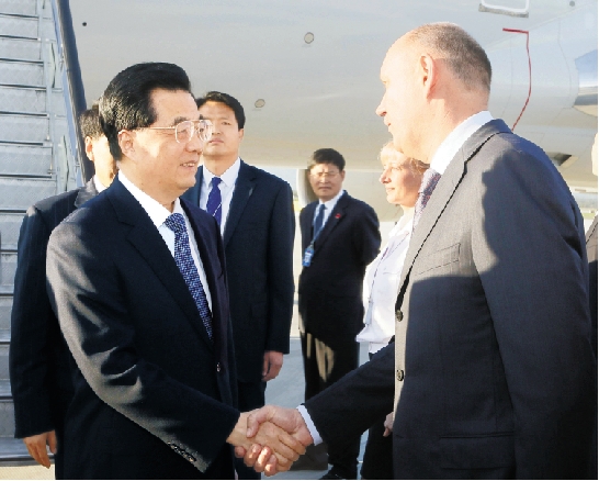 9月6日,国家主席胡锦涛乘专机抵达俄罗斯符拉迪沃斯托克,在机场受到俄罗斯政府及当地高级官员的热情迎接。