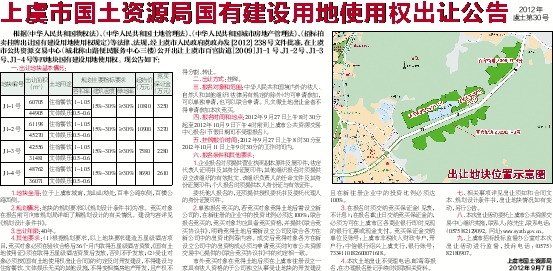 根据《中华人民共和国物权法》、《中华人民共和国土地管理法》、《中华人民共和国城市房地产管理法》、《招标拍卖挂牌出让国有建设用地使用权规定》等法律、法规,经上虞市人民政府虞政办发[2012]238号文件批准,在上虞市公共资源交易中心(城北称山路便民服务中心三楼)公开出让上虞市百官街道[2009]J1-1号、J1-2号、J1-3号、J1-4号等四地块国有建设用地使用权。现公告如下:
