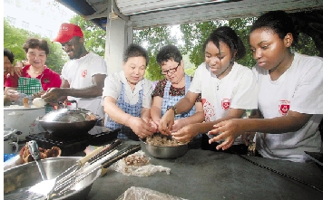 温州医学院中外大学生暑期社会实践团的学生来到东门红日亭帮厨,来自非洲的留学生们更为人们带来了充满异国风味的非洲美食。 陈翔 摄