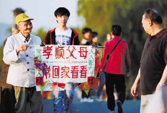 杭钢退休老人李师傅在西湖断桥高举牌子,提醒大家节假日常回家看看父母。 记者 潘良干 摄