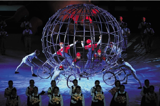 10月11日,省第五届职工运动会在杭州黄龙体育馆开幕。图为大型文体表演《阳光路上》。