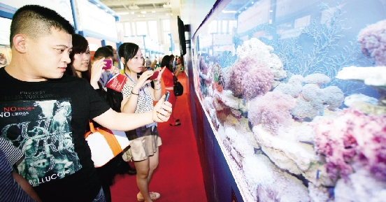 图为刚刚闭幕的宁波第二届中国海洋经济投资洽谈会上, 宁波海洋世界展出的海洋生物吸引众多参观者拍照。
