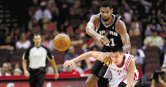 10月14日,火箭队球员林书豪(前)与马刺队球员邓肯拼抢。当日,在2012-2013赛季NBA季前赛中,休斯敦火箭队主场107比116不敌圣安东尼奥马刺队。 新华社发