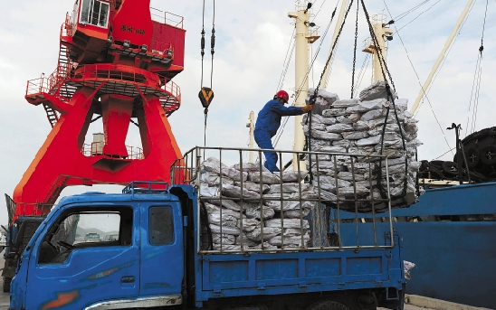 10月14日,一艘韩国运输船在舟山定海西码头卸下从秘鲁渔场捕获的鱿鱼。今年以来,该码头已接卸远洋冷藏运输船16艘,为水产品加工提供充足货源。 姚峰 摄
