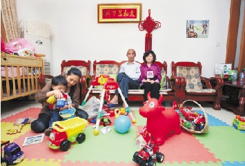 江西九江的左孟春(右一)一家在经济适用房的新家里(2011年4月26日摄)。 新华社发