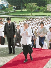 这是1993年9月24日,诺罗敦·西哈努克(前)参加签署王国宪法仪式,并宣布柬埔寨王国成立。 新华社发