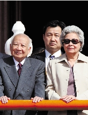 这是2009年10月1日,诺罗敦·西哈努克(左)与夫人莫尼列在北京参加中华人民共和国成立60周年大会。