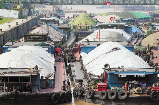 10月15日,杭州三堡船闸航道里,等待过闸的货船排起长队。受杭州连日晴天无雨导致低水位的影响,近千艘船舶在钱塘江船闸和京杭运河杭州段滞留。