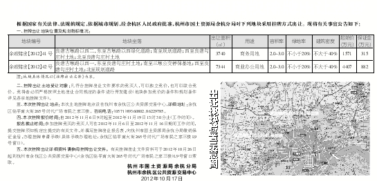 五、本次挂牌出让详细资料请参阅挂牌出让文件。有关挂牌出让文件资料可于2012年10月26日起到杭州市余杭区公共资源交易中心(余杭区临平南大街265号时代广场市民之家三楼)L9号窗口索取。