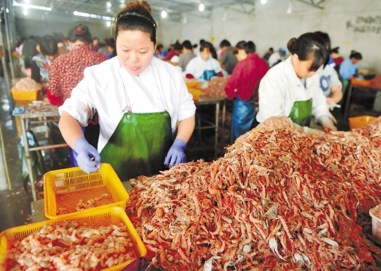 10月16日,一名职工在舟山普陀区一家水产公司剥虾。眼下正值秋汛,舟山拖虾渔船满载而归,当地水产公司收购加工的海虾,畅销上海、杭州等地。