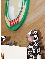 10月15日,在埃塞俄比亚亚的斯亚贝巴的非盟总部,南非内政部长、新任非盟委员会主席德拉米尼·祖马在就职仪式上讲话,正式接替担任这一职位4年的加蓬人让·平。 新华社发