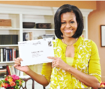 10月15日,美国第一夫人米歇尔·奥巴马在华盛顿展示自己提前投票的邮寄选票。 新华社发