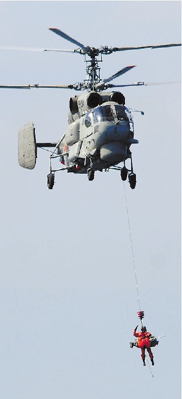 10月19日,在演习中,搜救直升机营救“落水人员”。 新华社发