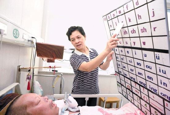 吴梅丽夫妻的交流就是通过这块拼音字母板。 记者 董旭明 摄