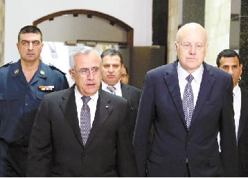10月20日,黎巴嫩总理米卡提(前右)与黎巴嫩总统苏莱曼在首都贝鲁特的总统府。 新华社发