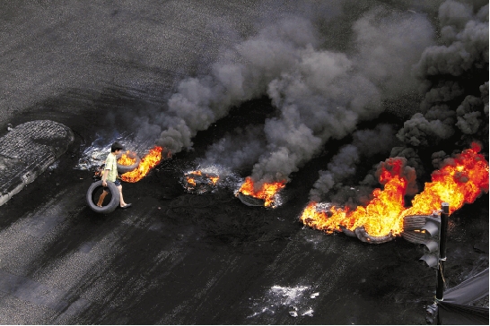 10月20日,在黎巴嫩南部城市西顿,一名年轻人准备把一个轮胎放入抗议者点燃的轮胎中。当日,黎巴嫩多地出现示威活动,抗议黎安全部队情报局长维萨姆·哈桑19日被炸身亡。 新华社发