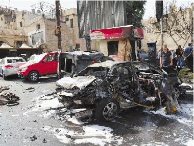叙利亚首都大马士革北城区当日遭到汽车炸弹袭击,造成至少13人死亡、29人受伤。这张叙通社提供的照片显示的是叙利亚首都大马士革爆炸现场的汽车残骸(摄于10月21日)。 新华社发