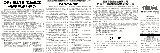 受衢州市中级人民法院委托,定于2012年11月8日(星期四)下午2时30分在衢州市县西街210号三楼拍卖:龙游县龙游大酒店有限公司位于衢州市龙游县太平东路38、39号房地产(含附着物、配套设施、动产等详见评估清单),房产证载面积合计13542.25㎡,无证房产合约1628.76㎡,商业、综合用地合计8180.37㎡,整体拍卖,起拍价5900万元,保证金600万元。