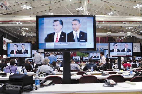 10月3日,在美国科罗拉多州丹佛大学,记者观看总统选举首场辩论转播。当日,美国总统选举候选人奥巴马与罗姆尼在科罗拉多州丹佛市丹佛大学举行今年美国总统选举首场辩论。 新华社记者 张军 摄