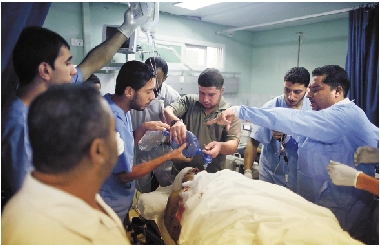 10月22日,医护人员在一家医院里救治在空袭中受伤的人员。以色列战机22日对巴勒斯坦加沙地带发动两轮空袭,造成2人死亡、5人受伤。 新华社发