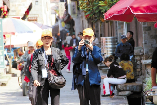 许多村庄和古镇以其“世外桃源”的风光吸引着越来越多的老年人。图为城里老人在子女的陪伴下游览江山廿八都。