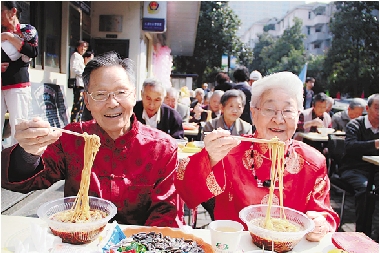 昨天,杭州江干区红菱社区为29对80岁以上金婚老人过重阳节。老人们吃着社工们做的长寿面,个个笑逐颜开。 栾国庆 摄