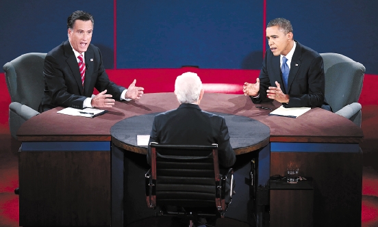 10月22日,在美国佛罗里达州博卡拉顿的林恩大学,美国总统奥巴马(右)和共和党总统候选人罗姆尼(左)出席第三场总统选举辩论。 新华社发