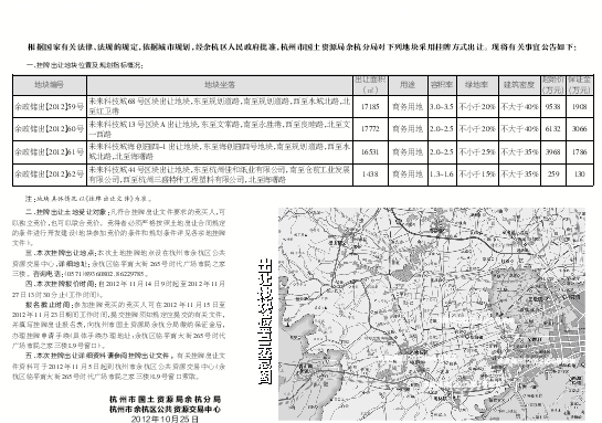 五、本次挂牌出让详细资料请参阅挂牌出让文件。有关挂牌出让文件资料可于2012年11月5日起到杭州市余杭区公共资源交易中心(余杭区临平南大街265号时代广场市民之家三楼)L9号窗口索取。