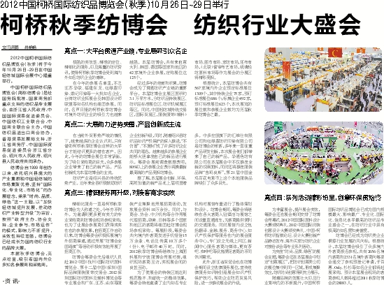 2012中国柯桥国际纺织品博览会(秋季)将于今年10月26日~29日在中国轻纺城国际会展中心隆重举行。