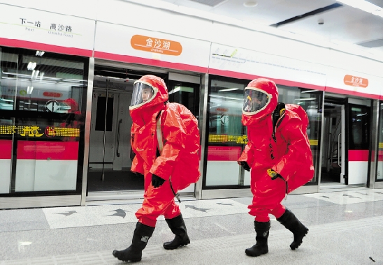 10月24日,杭州地铁集团在金沙湖站举行突发事件应急演练,应急办、消防、安保等部门现场参与演练。 本报记者 胡元勇 摄