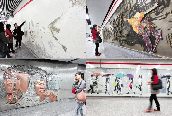 杭州地铁一号线开通临近,10月25日,各地铁站内的公共艺术墙也陆续撩开神秘的面纱。