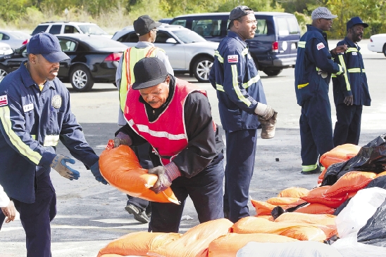 10月27日,在美国首都华盛顿,工作人员搬运沙袋,为抵御飓风“桑迪”做准备。 新华社发