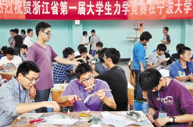 浙江省首届大学生力学竞赛近日在宁波大学开幕,竞赛题目为“火箭助推滑翔机设计制作与飞行”,来自省内25所高校的50支队伍参赛。 通讯员 嵇敏 岑雄鹰 摄