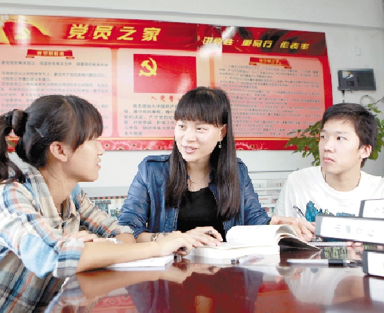 近日,嘉兴学院南湖学院学工党支部的杨晓燕(中)老师,在她的公寓办公室里与两位积极要求入党的同学交流思想。 通讯员 王骥东 摄