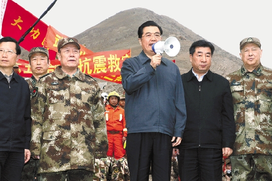 2010年4月18日,中共中央总书记、国家主席、中央军委主席胡锦涛在青海玉树地震灾区指导抗震救灾工作。这是胡锦涛在玉树县结古镇扎西科村慰问正在清理废墟的解放军和武警部队官兵、公安民警,充分肯定他们是抗震救灾的主力军,勉励他们出色完成各项抗震救灾任务。 新华社记者 兰红光 摄