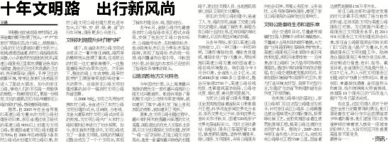 从2008年起,文明之风开始吹拂农村公路,全省进行了农村公路文明创建的试点,江碗线、分老线、龙金大道等农村文明公路试点项目的实施,为文明公路向广大农村公路拓展和延伸进行了初步探索。如今,浙江新农村建设中,文明公路成为了一条条文明线,沿线的村镇经过整治成为了一个个文明点,实现了新农村建设点、线、面的结合。