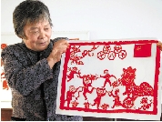 11月5日,今年66岁的宁波“非遗”传人、剪纸能手、浙江余姚凤山街道五星村村民俞爱春大妈在展示刚刚完成的剪纸作品,表达妇女姐妹们迎接中国共产党第十八次全国代表大会胜利召开的喜悦心情。 新华社发(吴大庆 摄)