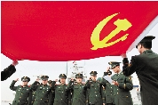 11月7日,二十多名即将退伍的老兵面对党旗庄严宣誓“护航十八大,站好最后一班岗”。