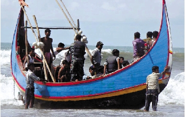 11月7日,沉船幸存者被孟加拉国边防警卫队救起后乘渔船准备上岸。 新华社发