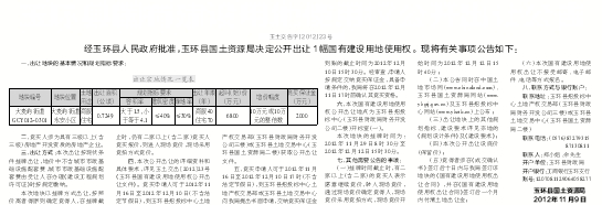 四、本次公开出让的详细资料和具体要求,详见玉土交出〔2012〕23号《玉环县国有建设用地使用权公开出让文件》。竞买申请人可于2012年11月16日至2012年12月10日(不含法定节假日),到玉环县招投标中心土地产权交易部(玉环县财政局财务开发公司三楼)或玉环县土地交易中心(玉环县国土资源局二楼)获取公开出让文件。