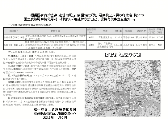 五、本次挂牌出让详细资料请参阅挂牌出让文件。有关挂牌出让文件资料可于2012年11月19日起到杭州市余杭区公共资源交易中心(余杭区临平南大街265号时代广场市民之家三楼)L9号窗口索取。