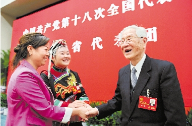 11月8日下午,我省出席十八大的两位80后代表吴菊萍(左一)和雷洁畅(左二),与九十高龄的薛驹代表交流参加盛会的感想。 本报记者 黄曙林 摄