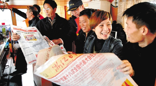 11月9日上午,在长湖申线航道上巡航的湖州港航人员与船民一起学习十八大报告。 周雨顺 何舒 摄