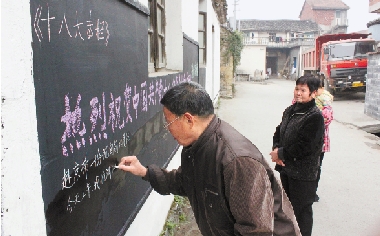 诸暨市应店街镇大马坞的老党员徐苗善,赶写十八大黑板报。 肖艳艳 何渊 摄