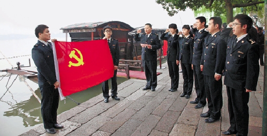 嘉兴海关党员在南湖红船边宣誓,表示要认真落实十八大精神,在岗位上立新功。 通讯员 王赟 俞晶 摄