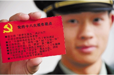 11月9日,台州市边防支队将党的十八大报告要点制成“口袋学习卡”,方便官兵随时随地学习。 郏策 摄