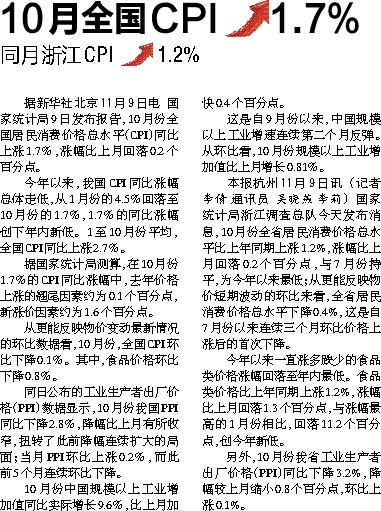 10月全国CPI 1.7%