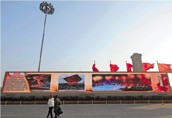 11月8日,天安门广场的电子屏正播放宣传片《科学发展铸辉煌》。 新华社记者 罗晓光 摄