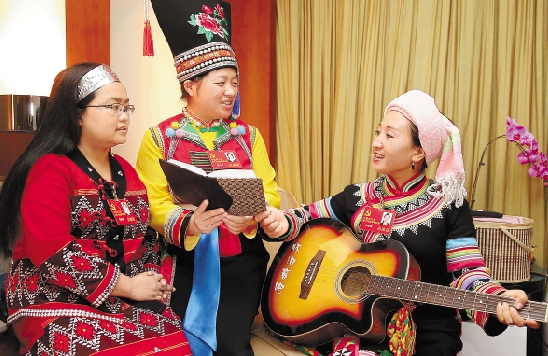 11月10日,十八大拉祜族代表李娜倮(右)在驻地演唱自创歌曲《感谢共产党》。 新华社记者 陈建力 摄
