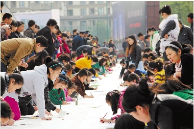 11月11日,桐庐县100名儿童进行百米长卷绘画比赛,孩子们纷纷用手中的画笔描绘出他们心中的“潇洒桐庐”。 何小华 陈燕 摄